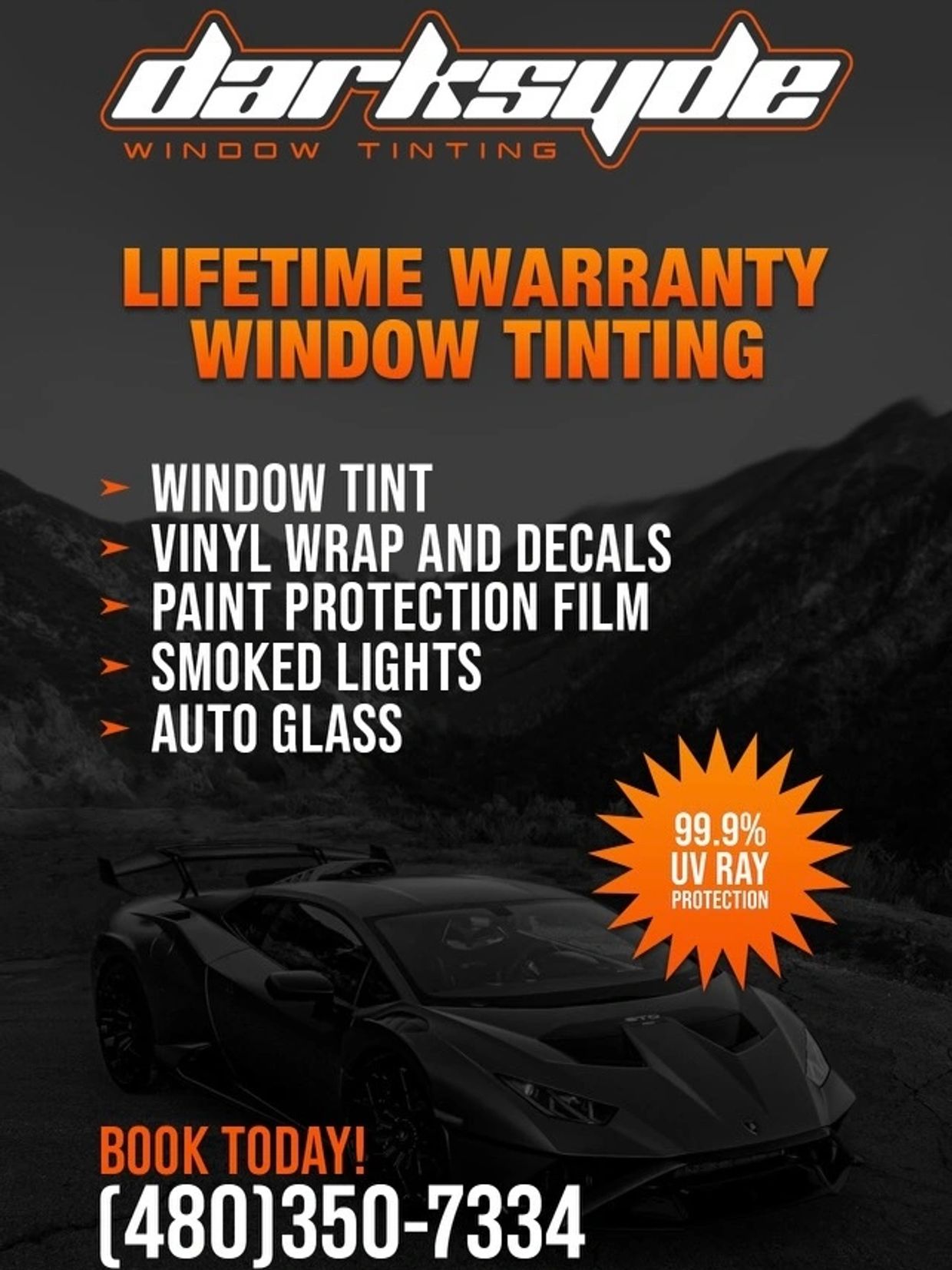 Welcome to the Darksyde located in Tempe. We are a family owned business with over twenty five years of top rated award winning, showroom quality experience.  Professional experts in Window Tinting, Paint Protection Film, Colored PPF, Vinyl Wraps, headlight / taillight film installation, clear windshield protection, auto glass replacement and wheel restoration in Tempe/Phoenix AZ.